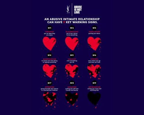 Intimate partner violence (IPV) is one of the most common forms of violence against women and includes physical, sexual, financial, and emotional abuse, as well as controlling behaviors by an intimate partner. P Research shows that IPV comes with key warning signs. If these signs can be detected earlier, we may be able to recognize it better and seek or offer help.5FP YSL Beauty aims to do its part in raising awareness of these common signs through the launch of the awareness campaign “9 WARNING SIGNS OF ABUSE”.