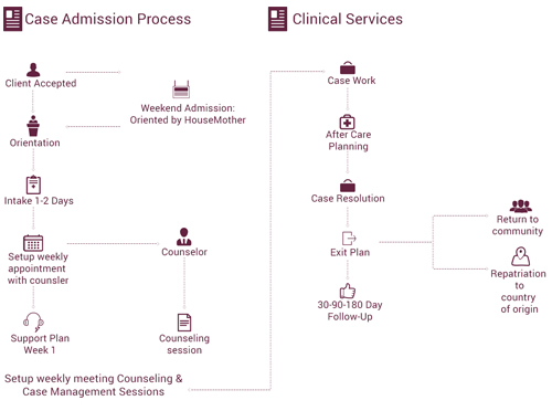A Case Manager is allocated to each client to follow up on all residential and medical procedures and then taking notes of the history of the abuse.